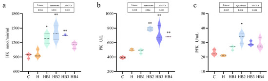 Effect of berberine supplementation in high-carbohydrate diets on the activities of glycolytic enzymes in tilapia. (a) HK, hexokinase; (b) PK, pyruvate kinase; (c) PFK, phosphofructokinase. One-way ANOVA and Dunnett’s test analyses (* p < 0.05 and ** p < 0.01). The three lines in the box plot are the upper quartile, the median and the lower quartile from top to bottom.