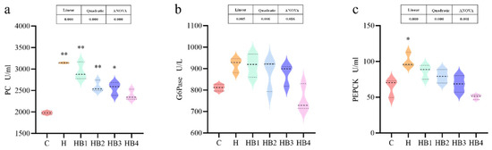 Effect of berberine supplementation in high-carbohydrate diets on the activities of gluconeogenic enzymes in tilapia. (a) PC, pyruvate carboxylase; (b) G6Pase, glucose-6-phosphatase; (c) PEPCK, phosphoenolpyruvate carboxykinase. One-way ANOVA and Dunnett’s test analyses (* p < 0.05 and ** p < 0.01). The three lines in the box plot are the upper quartile, the median and the lower quartile from top to bottom.