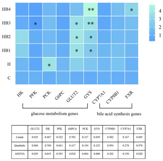 Through data screening (Table 5), there were 66 DEGs in the glycolysis/gluconeogenesis pathway of C vs. H carbohydrate metabolism, and one DEG in the primary bile acid synthesis pathway of lipid metabolism. There were 20 DEGs in the glycolysis/gluconeogenesis pathway of C vs. HB4. There were three DEGs in the primary bile acid synthesis pathway. There were two DEGs in the H vs. HB4 glycolysis/gluconeogenesis pathway and seven DEGs in the primary bile acid synthesis pathway.