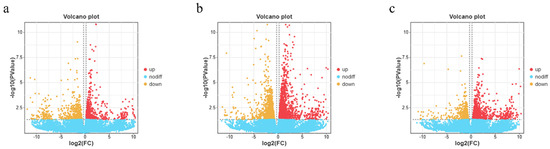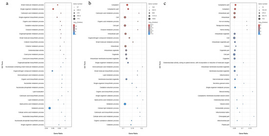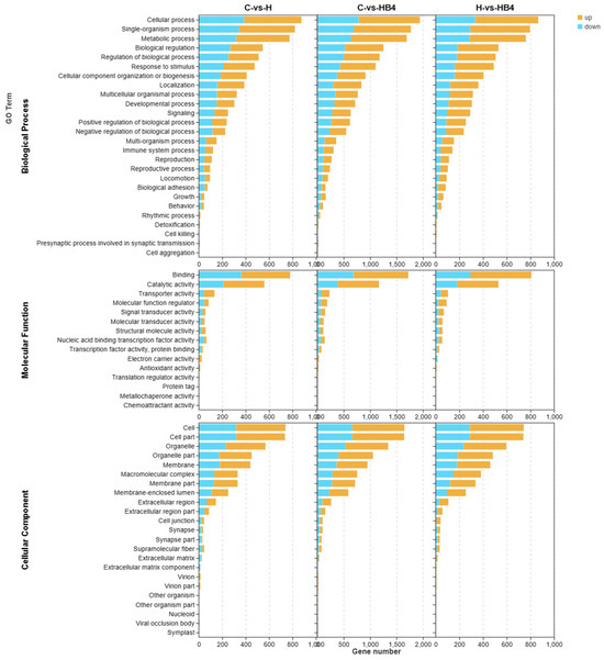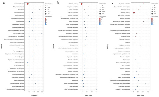 KEGG functional enrichment analysis of DEGs in (a) C vs. H, (b) C vs. HB4, and (c) H vs. HB4.
