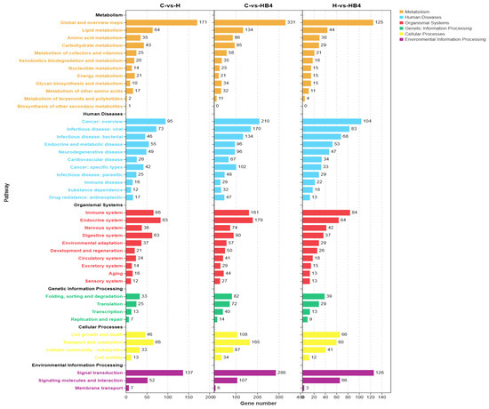 KEGG functional enrichment analysis of DEGs in C vs. H, C vs. HB4, and H vs. HB4.