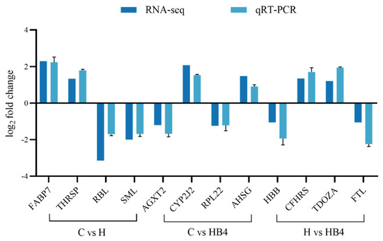 To verify the reliability of RNA-Seq sequencing data, 12 DEGs (FABP7, THRSP, RBL, SML, AGXT2, RPL22, CYP2J2, AHSG, HBB, CFHRS, FTL, TDOZA) were randomly selected for qPCR experiments. Six up-regulated and six down-regulated DEGs were included to further validate the gene expression results obtained from the RNA sequencing data. The results showed that the expression patterns of the 12 selected genes were consistent with the RNA sequencing results (Figure 21), further confirming the reliability of RNA-Seq.