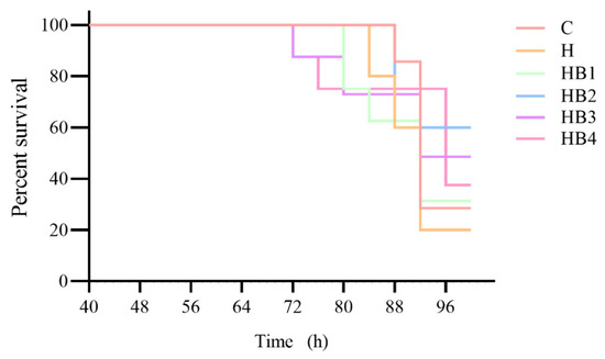 As shown in Figure 22, berberine supplementation in high-carbohydrate diets increased the survival rate of tilapia infected with Streptococcus agalactiae, with the highest survival rate in group HB2. Figure 23 showed that SOD, AKP and ACP were significantly reduced in group H compared to group C (p < 0.05), while berberine significantly increased the activity of SOD, AKP and ACP, with group HB3 being higher than the other groups.