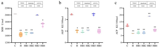 Effect of berberine supplementation in high-carbohydrate diets on the activities of SOD, AKP and ACP in the serum of tilapia after the injection of Streptococcus agalactiae. (a) SOD, superoxide dismutase; (b) AKP, alkaline phosphatase; (c) ACP, acid phosphatase. One-way ANOVA and Dunnett’s test analyses (* p < 0.05 and ** p < 0.01). The three lines in the box plot are the upper quartile, the median and the lower quartile from top to bottom.