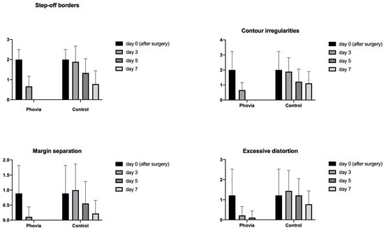 | 1 | Very slight borders (barely perceptible) | Very slight wrinkling (barely perceptible) | Very slight distance between wound edges (barely perceptible) | Very slight amount of edema and indication of infection |
