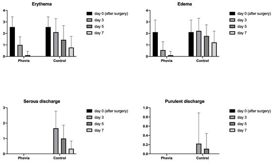 | Erythema | Edema | Serous Discharge | Purulent Discharge | |||||