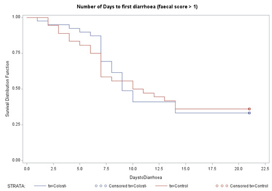 The number of days to first diarrhea (fecal score ≥ 2) were evaluated with survival analysis, and Kaplan–Meier plots indicated that there was no significant difference in days to diarrhea between Control and Colost-suppl. Calves (p = 0.97) (Figure 1).