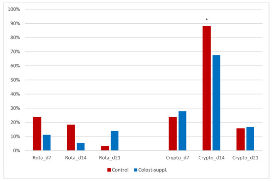 Histogram of % fecal samples that were found positive for rotavirus and Cryptosporidium parvum in Colost-suppl. and Control calves on days 7, 14, and 21. * = statistically significant difference in stratified analysis.