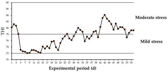 Average temperature–humidity index (THI) pattern in the barn during the experimental period.