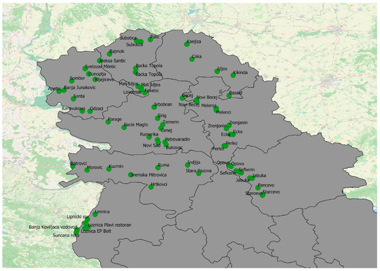 Mosquito sampling was conducted in Vojvodina Province, Serbia (65 locations), covering an area of 21,506 km2. In addition, eight locations belonging to the Mačva region (612 km2) were included. The locations were selected based on two criteria: first, to evenly cover the entire territory of Vojvodina Province and Mačva, andsecond, to prioritize areas with the presence of domestic animals and humans, where possible. Sampling was carried out at 73 locations in total (Figure 1) during the summer season of mosquito activity in 2021, from May to October. Due to the low number of Aedes albopictus Skuse 1894 collected in 2021 and the high significance of the filarial transmission of this invasive species, we included the samples from 2022 to increase the likelihood of parasite detection. The geo-coordinates of locations are shown in Table S1. This study only included adult female mosquitoes. Females were collected using CO2-baited (dry ice) adult traps (NS2 trap type). Traps were set up in the afternoon hours and operated overnight. Mosquito samples were then kept in dry ice until being transferred to the laboratory within the Centre of Excellence—One Health at the Faculty of Agriculture, University of Novi Sad, Serbia. When the samples arrived at the laboratory, mosquitoes were morphologically identified to species level, using the identification key by Becker et al. [42].