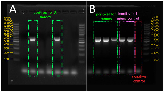 (A) Ae. vexans and Ae. caspius infected with S. tundra (product size of 650 bp, visualized on 1.3% agarose gel); (B) Cx. pipiens infected with D. immitis (product size of 650 bp, visualized on 1.3% agarose gel).