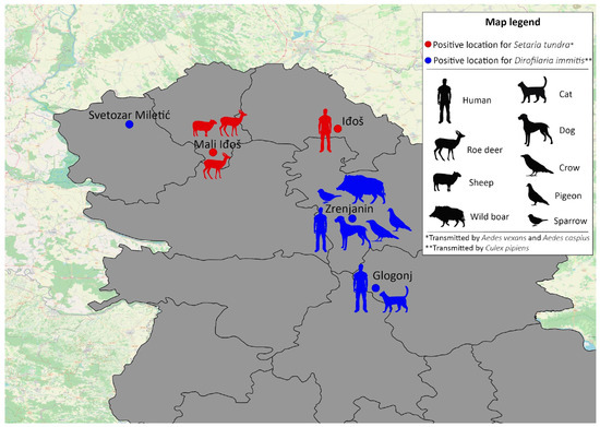 Locations with Dirofilaria immits- and Setaria tundra-positive mosquitoes, and detected blood-meal hosts.