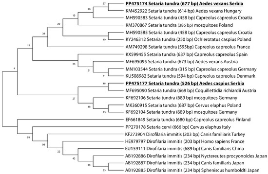 Phylogenetic analysis of S. tundra nucleotide sequences (~650 bp fragment) was performed using BLAST NCBI and MEGA v. 11.0 software [48] to align sequences and determine phylogenetic relationships. Maximum Likelihood with the Jones–Taylor–Thornton substitution model was used as the tree construction method. Additionally, BLAST searches were performed in GenBank, https://www.ncbi.nlm.nih.gov, (accessed on the 15 March 2024) and S. tundra matches showing a high genetic affinity were downloaded and incorporated into the alignment. Bootstrap analysis of 1000 randomly generated sample trees was performed to assess the stability of the inferred phylogenies. The selected outgroups were D. immitis and Setaria cervi (Rudolphi, 1819).