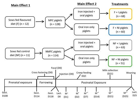 The experimental design and the times of the different treatments and procedures. MFC piglets = pigs from sows that received flavour feed during gestation and lactation; NMFC piglets = pigs from sows that received non-flavoured feed during gestation and lactation; NF + NI = piglets not exposed to maternal flavour conditioning and not injected with iron; NF + I = piglets not exposed to maternal flavour conditioning and injected with iron; F + NI = piglets exposed to maternal flavour condition and not injected with iron; F + I = piglets exposed to maternal flavour conditioning and injected with iron; Gest. = gestation; Focal = selection of focal piglets for blood collections; Inj = administration of iron injection; Lact. = lactation; M+ = performance and blood measurements; M* = behavioural measurements; M+* = performance, blood and behavioural measurements.