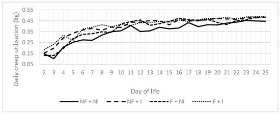 Effects of maternal flavour conditioning and iron administration treatments on averaged daily litter creep feed utilisation from all litters assigned to their corresponding treatment groups within the three replicates. No flavour exposure and non-injectable iron (NF + NI). No flavour exposure and injectable iron (NF + I). Flavour exposure and non-injectable iron (F + NI). Flavour exposure and injectable iron (F + I).