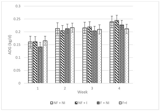 Effects of maternal flavour conditioning and iron administration treatments on piglet ADG over the study. No flavour exposure and non-injectable iron (NF + NI). No flavour exposure and injectable iron (NF + I). Flavour exposure and non-injectable iron (F + NI). Flavour exposure and injectable iron (F + I). Week 1 (days 0–7), Week 2 (days 7–14), Week 3 (days 14–21) and Week 4 (days 21–25).