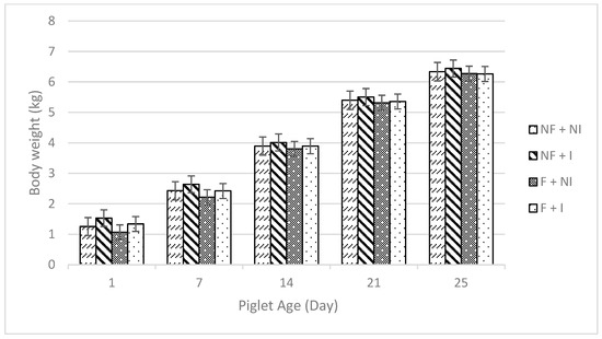 Effects of maternal flavour conditioning and iron administration treatments on piglet body weight over time until weaning (day 25). No flavour exposure and non-injectable iron (NF + NI). No flavour exposure and injectable iron (NF + I). Flavour exposure and non-injectable iron (F + NI). Flavour exposure and injectable iron (F + I).