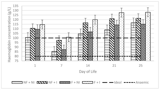 General consensus classifies a piglet as anaemic once the reduced haemoglobin concentration depresses ADG or the piglet expresses clinical signs such as pale skin. This corresponds with haemoglobin concentrations of less than 80 g/L [30]. Piglets with haemoglobin concentrations of 100 g/L are considered within normal range and those with values of 80–99 g/L are considered to have sub-clinical anaemia [30]. Our findings are congruent with the literature as the lowest haemoglobin concentration in the NI + NF treatment declined to 85 g/L during the first week of life. This treatment group did not display any signs of clinical anaemia or depression in ADG and all piglets, regardless of the treatment group, achieved similar growth of 150 g per day during the first week of life, aligning with Australian performance standards [31].