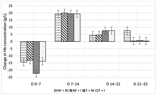 The general decline in haemoglobin concentrations across treatment groups in the first week after parturition corroborates with literature stating that the limited iron in sow milk, plasma expansion and rapid growth all contribute to this negative change in haemoglobin concentrations in piglets [8,15]. All piglets had access to iron-supplemented creep feed, while haemoglobin concentrations and ADG of piglets receiving no iron injections were comparable to piglets receiving standard iron injections shortly after birth. These results align with previous research conducted by Maes et al. [11], who first demonstrated that the combined effects of organic and inorganic supplements in creep feed provisions were able to combat anaemia via voluntary intake with specially designed feeders.