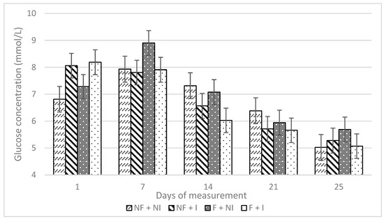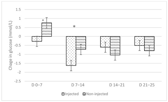 Flavour and flavour interaction with iron supplementation had no significant effect on average or weekly changes in glucose concentrations (Table 2). All treatments demonstrated relatively constant blood glucose concentrations (Figure 7). Iron supplementation had no effect on average glucose concentrations but significantly affected weekly changes in glucose concentrations (Table 2) as non-injected piglets had a positive change in glucose concentrations in the first week (non-injected, 0.758 mmol/L ± 0.290 and injected, −0.274 mmol/L ± 0.285) and a reduced negative change in glucose concentrations in the second week (non-injected, −0.725 mmol/L ± 0.290 and injected, −1.624 mmol/L ± 0.295) compared with the injected piglets (Figure 8).