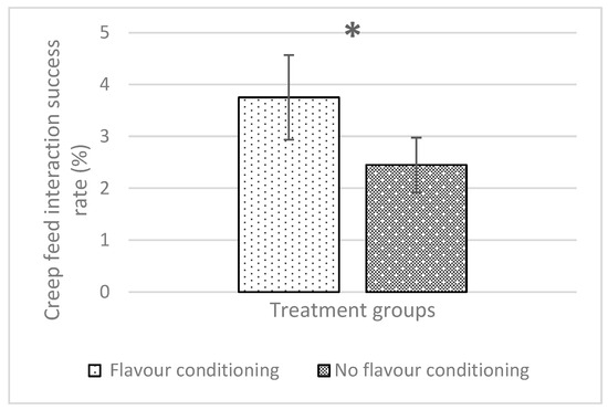 Effect of maternal flavour conditioning on the overall success of piglet–creep interactions. * indicates significant difference (p < 0.05).