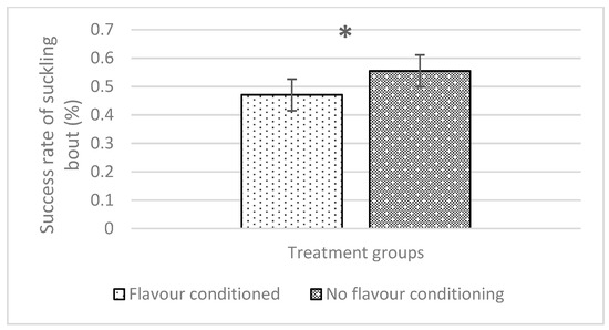 Effect of maternal flavour conditioning on the overall success suckling bouts with milk letdown. * indicates significant difference (p < 0.05).