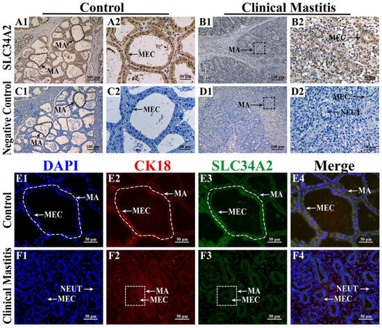 Distribution and co-localization analysis of SLC34A2 protein in MGs. (A1–B2) IHC staining shows SLC34A2 distribution in MGs of Con/C (A1,A2) and CM (B1,B2) groups. (C1–D2) SLC34A2 negative controls for Con/C (C1,C2) and CM (D1,D2) groups. (E1–F2) Localization in MGs: nuclei (blue, E1,F1), CK18 (red, E2,F2), SLC34A2 (green, E3,F3), with merged CK18 and SLC34A2 (E4,F4) for Con/C and CM, respectively. Con/C represents healthy Holstein cows; CM indicates cows with clinical mastitis. NC: negative control; MA: mammary alveoli; MECs: mammary epithelial cells; NEUT: neutrophil. Scale bars: 50 nm (200× magnification) and 100 nm (400× magnification).