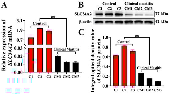Expression pattern analysis of SLC34A2 mRNA and protein in MGs. (A) mRNA levels of SLC34A monitored by qRT-PCR assay. (B) Protein bands of SLC34A monitored by Western blot assay; the whole Western blots are shown in Figures S1 and S2. (C) Optical density of bands. Con/C, control. CM, clinical mastitis. Data are presented as means ± SEM. ** represents p < 0.01.