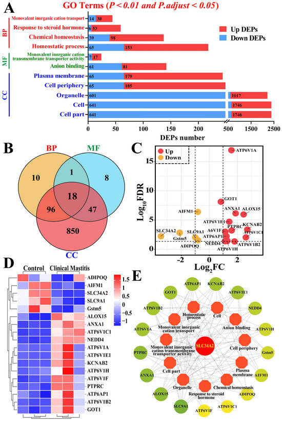 Identification of candidate DEPs and GO terms related to Ca/P metabolism and involved with SLC34A2 between control and clinical mastitis groups based on GO enrichment data. (A) Candidate DEPs and GO terms with significance of p < 0.01 and p.adjust < 0.05 related to Ca/P metabolism and involving SLC34A2. X-axis represents the number of DEPs. Y-axis represents GO terms including biological process (BP), molecular function (MF), and cellular component (CC). (B) Venn diagram of candidate DEPs in BP, MF, and CC groups. (C) Volcano plots of 18 DEPs, including 5 downregulated and 13 upregulated DEPs. (D) Heat map of 18 candidate DEPs. (E) PPI network analysis of 18 DEPs and 11 GO terms related to Ca/P metabolism.