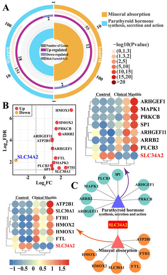 Identification of candidate DEPs and pathways related to Ca/P metabolism and involved with SLC34A2 between the control and clinical mastitis groups based on pathways. (A) Candidate DEPs and pathways related to Ca/P metabolism and involving SLC34A2. (B) PPI network and heat map analysis of mineral absorption and PTH synthesis, secretion, and action pathways related to Ca/P metabolism involving SLC34A2. (C) Volcano plots of 14 DEPs: 1 downregulated and 13 upregulated.