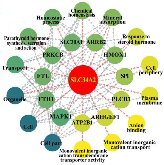 According to the results of distribution and expression patterns, GO functional enrichment, and pathway analysis, SLC34A2 is a crucial DEP that may regulate ion metabolism and homeostasis. To confirm this relationship, a PPI network was constructed based on the data (Figure 6). The results demonstrate that SLC34A2 is a unique DEP that interacts with all selected GO terms, pathways, and DEPs. For instance, SLC34A2 may directly regulate ion metabolism, transport, and mineral absorption via heme oxygenase-1 (HMOX1), ferritin heavy chain 1 (FTH1), and specific protein 1 (SP1), respectively. SLC34A2 may also directly regulate homeostatic processes and chemical homeostasis via different proteins, such as protein kinase C beta type (PRKCB) and ferritin light chain (FTL). This evidence confirms that SLC34A2 can directly or indirectly regulate Ca/P metabolism and homeostasis and participate in the occurrence and development of CM in dairy cows.