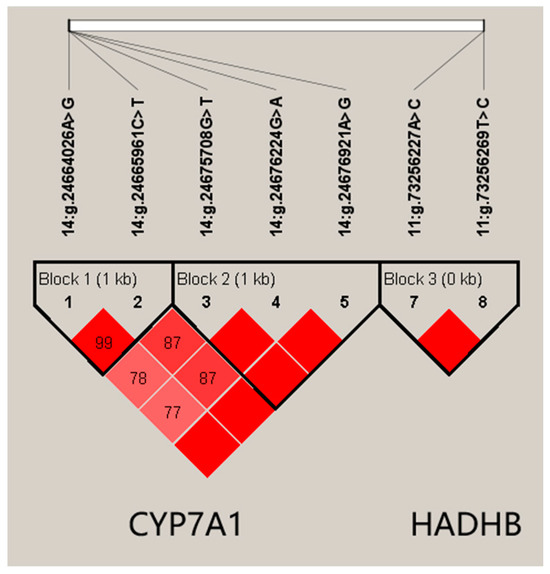 Linkage disequilibrium estimated between SNPs in CYP7A1 and HADHB gene. The blocks indicate haplotype blocks, and the text above the horizontal numbers is the SNP names. The values in the red boxes are pair-wise SNP correlations (D′, while bright red boxes without numbers indicate complete linkage disequilibrium (LD) (D′ = 1)).