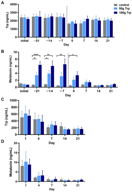 Figure 1. The effects of L-tryptophan supplementation on the levels of tryptophan and melatonin in serum and milk of the cows. (A) serum tryptophan content; (B) serum melatonin content; (C) milk tryptophan content; (D) milk melatonin content. “Initial” indicates sampling before cows were fed; −21, −14 and −7 indicate the number of days until the cows gave birth; 1, 4, 7, 14 and 21 indicate the number of days after the cows gave birth. The dotted line, day 0, represents the time when the cow calved and also when L-tryptophan supplementation stopped. All data are expressed by mean ± standard error. * p < 0.05, ** p < 0.01, **** p < 0.0001.