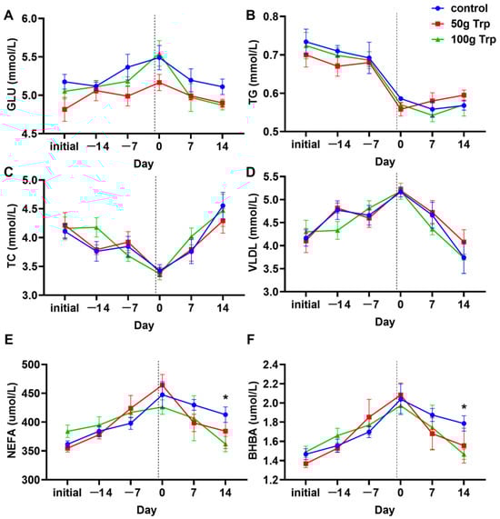 Figure 2. Effects of L-tryptophan supplementation on serum glucose and lipid metabolism in cows. (A) serum glucose (GLU) level; (B) serum triglyceride (TG) level; (C) serum total cholesterol (TC) level; (D) serum very-low-density lipoprotein (VLDL) level; (E) serum non-esterified fatty acid (NEFA) level; (F) serum β-hydroxybutyric acid (BHBA) level. “Initial” indicates sampling before cows were fed; −14 and −7 indicate the number of days until the cows gave birth; 7 and 14 indicate the number of days after the cows gave birth. The dotted line, day 0, represents the time when the cow calved and also when L-tryptophan supplementation stopped. All data are expressed by mean ± standard error. * p < 0.05.