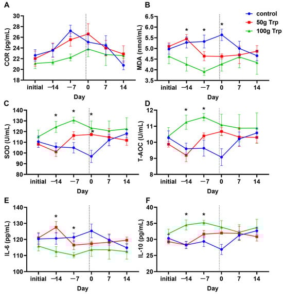 Figure 3. Effects of L-tryptophan supplementation on serum antioxidant and immune-related indexes of cows. (A) serum cortisol (COR) level; (B) serum malondialdehyde (MDA) level; (C) serum superoxide dismutase (SOD) level; (D) serum total antioxidant capacity (T-AOC) level; (E) serum interleukin-6 (IL-6) level; (F) serum interleukin-10 (IL-10) level. “Initial” indicates sampling before cows were fed; −14 and −7 indicate the number of days until the cows gave birth; 7 and 14 indicate the number of days after the cows gave birth. The dotted line, day 0, represents the time when the cow calved and also when L-tryptophan supplementation stopped. All data are expressed by mean ± standard error. * p < 0.05.