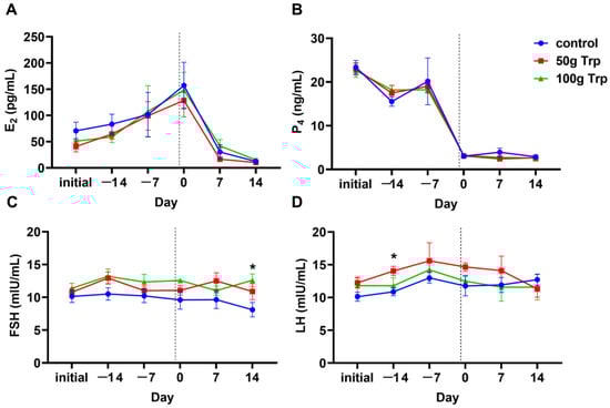 Figure 4. The effects of prepartum L-tryptophan supplementation on serum reproductive hormones of cows. (A) serum E2 level; (B) serum P4 level; (C) serum FSH level; (D) serum LH level. “Initial” indicates sampling before cows were fed; −14 and −7 indicate the number of days until the cows gave birth; 7 and 14 indicate the number of days after the cows gave birth. The dotted line, day 0, represents the time when the cow calved and also when L-tryptophan supplementation stopped. All data are expressed by mean ± standard error. * p < 0.05.