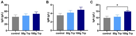The contents of IgG and IgM in the colostrum of dairy cows treated with L-tryptophan showed no significant differences compared to the control group (p > 0.05) (Figure 5A,B); however, the IgA content in the 100 g prepartum-L-tryptophan-treated group was significantly higher than that in the control group (p < 0.05) (Figure 5C).