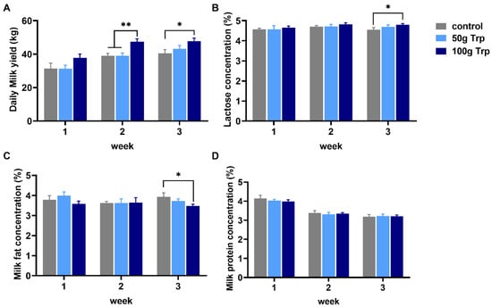 Figure 6. Effects of prepartum L-tryptophan supplementation on daily milk yield and milk compositions. (A) daily milk yield; (B) milk lactose concentration; (C) milk fat concentration; (D) milk protein concentration. All data are expressed as mean ± standard error. * p < 0.05, ** p < 0.01.