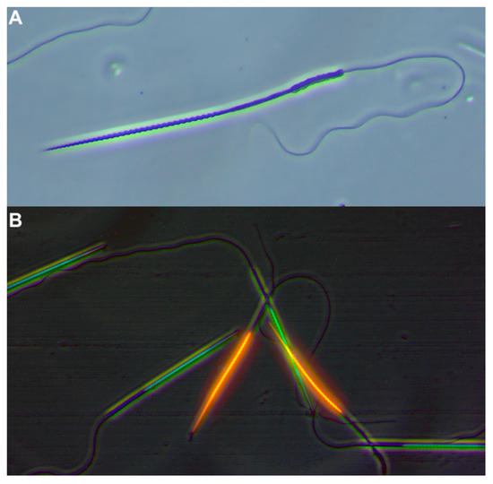 Representative images of small-spotted catshark (Scyliorhinus canicula) sperm cell quality. Scale bar, 20 μm. (A) Phase-contrast image of sperm cells at 400× magnification. (B) Phase-contrast and epifluorescence merged micrographs of sperm cells stained with SYBR-14 (green) and propidium iodide (red) at 200× magnification. Green fluorescence shows live sperm, and red fluorescence indicates dead sperm.