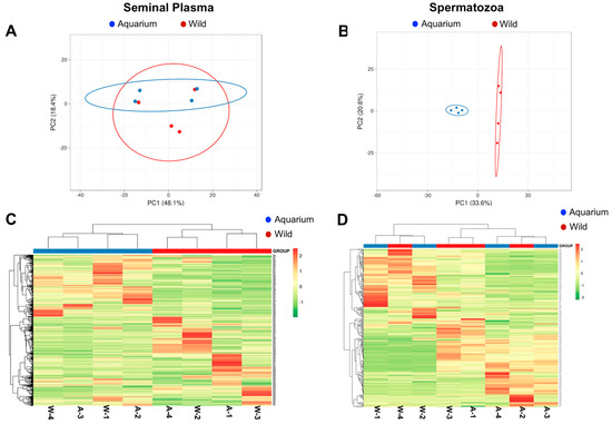 A total of 305 and 535 proteins were detected in all seminal plasma and spermatozoa samples, respectively. PCA was performed for both cohorts, showing differentiated sample clusters based on the seminal plasma and spermatozoa proteins from semen collected from aquarium and wild animals (Figure 2). Concerning the quantified seminal plasma proteins, the first two components of the PCA explained 100% of the total variance (PC1 68.6% and PC2 31.4%), discriminating between the four replicates of the aquarium and those of the wild (Figure 2A). The same analysis for spermatozoa showed 54.2% of the total variance (PC1 33.6% and PC2 20.6%) (Figure 2B). The PCA result for seminal plasma proteins did not show such clear clustering because scarce differences were observed between groups. Heat map analysis corroborated the PCA analysis, showing small differences clustered together for seminal plasma (Figure 2C), while they were clearly marked for spermatozoa proteins (Figure 2D).