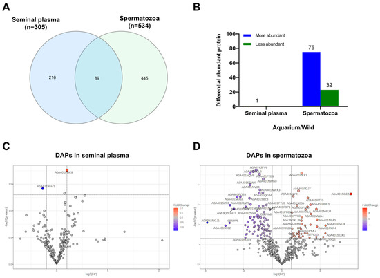 Differentially abundant proteins in seminal plasma and spermatozoa protein extracts from wild and aquarium samples of small-spotted catshark (Scyliorhinus canicula). (A) Venn diagram showing the number of unique proteins in seminal plasma and spermatozoa samples. (B) Number of proteins exhibiting significant differences within seminal plasma and spermatozoa between aquarium and wild groups. Visualizations of DAPs in volcano plots using Metaboanalyst are as follows: the x-axis represents logFC; the y-axis represents the −log10 of a p-value of <0.05. Proteins with logFC ≥ 1 are represented by red dots, and those with logFC ≤ −1 by blue dots. Significant DAPs are labeled with gene names. Black dots indicate proteins that did not show significant changes. (C) Volcano plot for seminal plasma proteins. (D) Volcano plot for spermatozoa proteins.