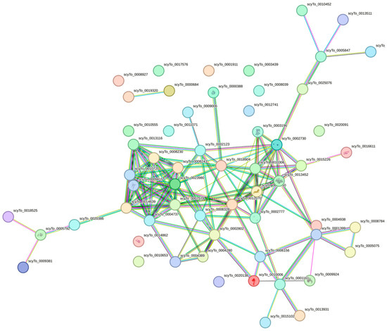Protein-protein interaction networks of spermatozoa proteins differentially abundant between wild and aquarium semen annotated in the UNIPROT in cloudy catshark (Scyliorhinus torazame). One cluster of interacting proteins was identified using the STRING software (version 12. https://string-db.org, accessed on 1 March 2024) with a high confidence score. The line size indicates a high interaction score (tight lines indicate a high score > 0.7; thin lines indicate a medium score > 0.4). Each node represents a protein, whereas edges indicate the strength of the relationship between proteins (i.e., more edges indicate higher confidence). The proteins identified in small-spotted catshark spermatozoa of aquarium and wild males are shown in Table 2.