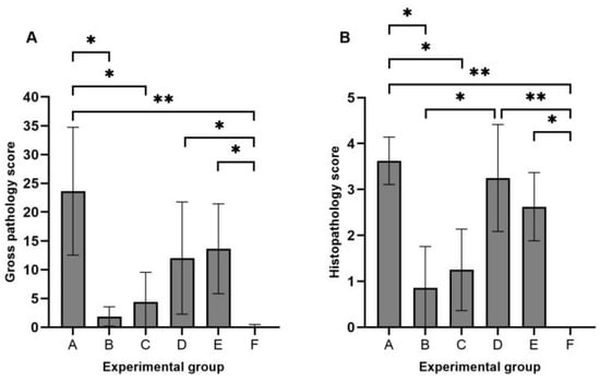 Gross pathology (A) and histopathology scoring (B). * p-value < 0.05; ** p-value < 0.001.