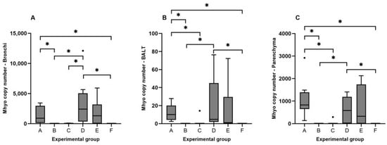 Box plots of Mhyo DNA quantification results in bronchi (A), BALT (B), and lung parenchyma (C). * p-value < 0.05.