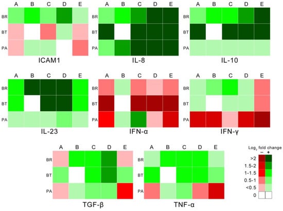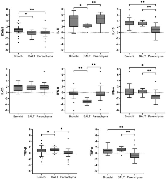 ICAM1 was slightly upregulated in the bronchi (log2 FC: 0.94), whereas BALT and lung parenchyma displayed a slight downregulation (log2 FC: −0.29 and −0.1, respectively). IL-8 was markedly upregulated in bronchi (log2 FC: 4.2) and lung parenchyma (log2 FC: −4.6), with a lesser response in BALT (log2 FC: 2.2). IL-10 also presented a relevant upregulation in bronchi (log2 FC: 3.4) and BALT (log2 FC: 3.1), while the expression levels were significantly lower in parenchyma (log2 FC: 0.9). IL-23 was slightly upregulated in all tissues, ranging from 1.6 to 1.8 log2 FC, with no significant differences between values observed. IFN-α downregulation was marked for BALT (log2 FC: −3.1). Additionally, a less marked downregulation was also observed for bronchi (log2 FC: −0.5) and parenchyma (log2 FC: −0.3). IFN-γ expression was relatively stable after Mhyo infection in bronchi and BALT, while downregulation of this cytokine was observed in lung parenchyma (log2 FC: −1.5). TGF-β upregulation was also mild, with log2 FC values ranging from 0.9 for BALT to 0.2 for parenchyma. A similar result was observed for TNF-α in bronchi and BALT, with a mild upregulation (log2 FC: 0.6 and 1.1, respectively), while a slight downregulation was detected in parenchyma (log2 FC: −0.6).