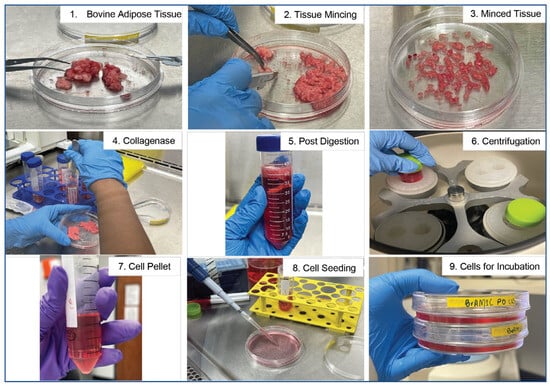Among all domesticated species, cattle have major significance in the economics of the livestock industry, with 69.6 million tons of meat and 811 million tons of milk produced worldwide in 2017 [1,2]. There are several medical conditions that can negatively impact meat and milk production as well as reproductive efficiency in cattle. For cattle with high economic potential, these losses pose significant costs to the livestock industry. For example, bovine respiratory diseases are economically devastating in the US cattle industry costing producers over an estimated USD 500 million each year, and treatment has exclusively involved antibiotics [3]. There is heightened immune activity associated with respiratory diseases in cattle that could result in lung tissue destruction [4]. Other diseases that affect cattle include mastitis, digestive disorders, encephalopathies, and white muscle disease, to name a few [5]. Considering the potential of stem cells in tissue repair and regeneration, obtaining mesenchymal stem/stromal cells (MSCs) from bovine adipose tissue could be utilized for addressing a variety of disorders that require anti-inflammatory interventions and pro-regenerative functions.