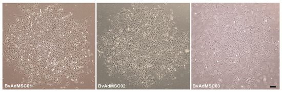 Bovine adipose tissue-derived MSC morphology. Phase-contrast images of bovine adipose tissue-derived MSCs from three individual animals (BvAdMSC 01, BvAdMSC 02, BvAdMSC 03) isolated successfully by plastic adherence. All bovine adipose tissue-derived MSCs adhered to plastic and were spindle-shaped in morphology. Colony formation was observed within 2 week of plating digested tissue fractions. Scale bar: 100 μm.