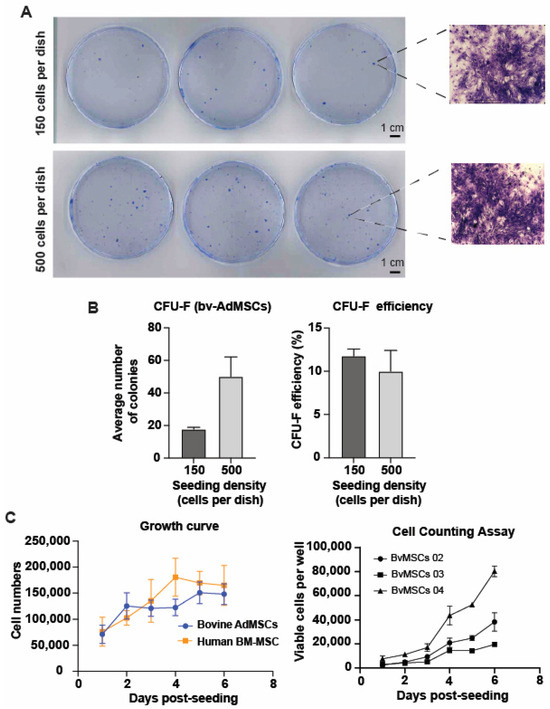 Phenotypic characterization: Colony formation and proliferative potential of bovine adipose tissue-derived MSCs. Adherent MSCs formed colonies when seeded at low densities, indicating their self-renewal ability and colony forming potential. (A). Scanned images of plates showing colonies of MSCs stained with crystal violet dye. Two different seeding numbers (150 cells per dish and 500 cells/dish) were tested. Scale bar: 1 cm. Microscopic examination of stained colonies at 4× magnification indicate that BvAdMSCs meet the criteria for definition as an MSC colony comprising of at least 50 cells per colony. (B). Bar graph showing the average number of colonies formed with two different seeding densities. The efficiency of colony formation (%) was similar between the two groups, together indicating that seeding densities did not affect overall CFU–F efficiency. (C). Line graph showing growth of BvAdMSCs in comparison with human bone marrow-derived MSCs. BvAdMSCs proliferated well in vitro over a period of 6 d, generating cell numbers similar to human MSCs. Cell counting kit assay using the Cell Counting Kit-8 solution to quantify the number of viable cells based on their absorbance at 450 nm. The line graph shows the viable cell number per well in a 12-well plate vs. days post-seeding from three different BvAdMSC groups (BvAdMSC 02, BvMSC 03, and BvMSC 04).