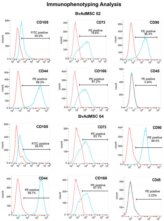 Flow Cytometric Analysis of BvAdMSCs Cell Surface Markers. Expression of typically positive mesenchymal stem cell markers CD105, CD73, CD90, CD44, and CD166 and typically negative mesenchymal stem cell marker CD45 were quantified using flow cytometry. The percentage of cells positive for a specific marker is indicated on the histogram. The surface marker histogram is denoted in blue, and the isotype control gated at 5% is denoted in red.