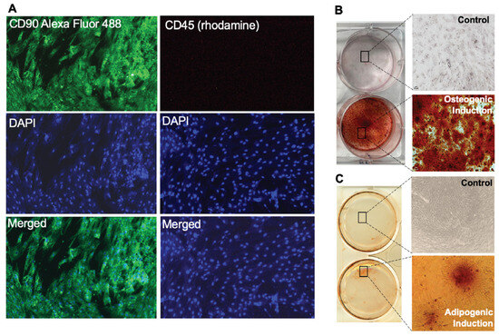 Additionally, we found that immunocytochemistry studies performed on the bovine adipose-derived MSCs showed positive expression for the CD90 surface marker. The CD90 surface marker was conjugated with Alexa 488 fluorophore, represented by a distinct green color on the stained cells (Figure 5A, left panel). The CD45 surface marker is a membrane glycoprotein with a molecular mass of about 200 kDa, that is a leukocyte common antigen and is expressed on most hematopoietic cells [32,33]. The cells were negative for the CD45 surface marker, which is characteristic to MSC populations (Figure 5A, right panel).
